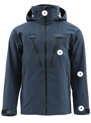 Fully adjustable drop hood prevents hood from bunching around the back of the neck when fully zipped. Hidden Cohaesive® hood adjusters are located in exterior chest pockets to prevent line snagging.